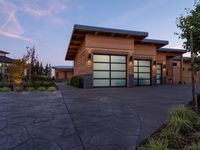 A view of a residential property with a house and a facade made of wood. The property is surrounded by lush vegetation and trees. The cloudy sky casts a shadow on the road surface and the grassy land lot.