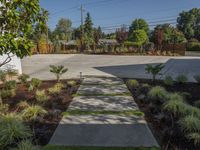 a paved driveway between two trees and bushes and with one tree in the background, with grass at one side