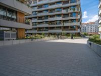 an open courtyard area in front of a residential building with apartments behind it on a clear day