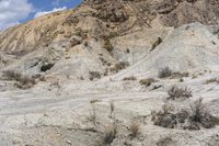 This stock photo features a person riding their horse through the desert terrain at a scenic area in the mountains of Spain. The landscape is characterized by sand, dirt, and mountain landforms with bedrock outcrops. The open space and clear sky create a beautiful natural setting. The off-road track provides a thrilling adventure, surrounded by vegetation and gravel formations. The person is enjoying the day under the clear sky in the Tabernas region of Spain, known for its unique desert landscapes in Europe.