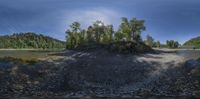 River and Forest Landscape with a Pile of Dirt