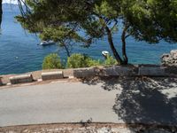 An elevated road in Mallorca, Spain, offers panoramic views of the coastal landscape and the clear blue waters of the Mediterranean Ocean. The high road cuts through the nature of the Balearic Islands.