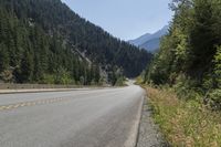 A motorbike parked by the side of an asphalt road in British Columbia, Canada. Surrounding landscape features majestic mountains and dense forests. Clear skies and natural environment create a serene atmosphere in Lillooet.