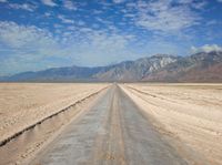 This stunning stock photo captures a scenic road surrounded by lush vegetation, with a clear blue sky and majestic mountains in the background. The straight asphalt road leads straight towards the distant horizon, providing an adventurous and rugged feel. The road, located in California, USA, is surrounded by desert, gravel, and dirt tracks, adding to the natural beauty of the landscape. The cloudless day perfectly showcases the untouched nature and serene atmosphere of this picturesque plain. This image is perfect for projects related to travel, adventure, nature, and exploration.