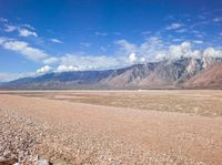 A scenic landscape with rugged mountains and a road winding through the grassy plains. Clear sky with fluffy clouds creates a picturesque backdrop. A perfect destination for off-road enthusiasts.