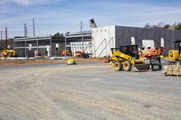 Construction site in Johnson City, Tennessee, with rugged road surfaces and vehicles. Concrete and asphalt contrast with open green spaces. Construction workers busy at work under a clear sky.