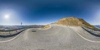 A road through the mountains of New Zealand's South Island. The asphalt highway winds through the stunning landscape, surrounded by towering mountains and clear skies. The unique 360-degree lens style captures the natural beauty of this lowland mountain pass.