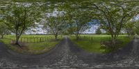 A road cuts through a lush, tree-filled pasture area. The fenced-in land lot is surrounded by green vegetation. The clear sky contrasts with the gloomy, grey sky. A serene and natural environment.