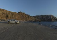 This stunning stock photo captures the breathtaking dawn scenery along the coastal region of Portugal in Europe. The image showcases a winding road that cuts through the picturesque landscape, with captivating water and ocean views on one side and towering mountains on the other. The road, made of smooth asphalt, leads through an open space surrounded by nature, making it a perfect destination for a road trip. The bedrock terrain and horizon merge seamlessly with the clear sky above, creating an incredible backdrop for any automobile adventure. The grey concrete road surface is illuminated by the first light of break of day, while vehicles with tires and wheels can be seen traversing the route, adding a sense of movement and excitement to the scene.