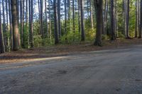 this is a road in the woods, that is surrounded by a lot of trees