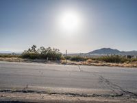 A stretch of asphalt road in the California desert offers a captivating view. Clear skies highlight the arid landscape of Los Angeles. The scene is a classic depiction of a sunny day in Southern California.