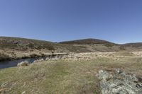A breathtaking view of a mountain slope covered in lush vegetation and surrounded by a clear sky. The terrain is a mix of grass, dirt, gravel, and rocks, with a river flowing through the open space. A perfect day to explore and connect with nature.