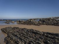 A picturesque coastal landscape in Portugal. The beach is adorned with rocks and surrounded by clear blue seawater. The open space and clear sky create a serene and tranquil atmosphere.