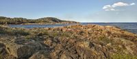 A rocky beach along the coast, with trees in the distance. The highland terrain and bedrock create a stunning landscape. The sunny afternoon sky and grassy hill complete the picturesque scenery.
