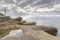 This image captures the dramatic coastal landscape at dawn. The grey sky and gloomy atmosphere create a contrasting backdrop for the sun visible on the horizon. The rocky terrain features cliffs, crags, and a bedrock surface, with a lighthouse standing tall on a bluff. The open space and water add to the beauty of this scenic view. The sun's rays shine down on the landscape, illuminating the wood and gravel surfaces. This photo represents the serene and breathtaking beauty of the coastal region, with a mix of sunshine and gloomy elements.