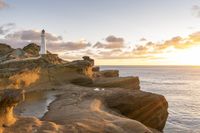 Rocky Coastal Landscape at Dawn with Lighthouse and Boat