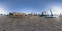 A panoramic view of the city of Rotterdam in Holland. The cityscape features modern architecture, high-rise buildings, and a cable-stayed bridge. The road leads towards the river, creating an open space. The image captures the city's vibrant urban design and the beauty of the waterfront.