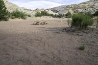 a view of a dry, arid area with plants and bushes around it with some hills behind