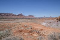Rugged desert landscape in Canyonlands, Utah. Red rock formations and brown bedrock outcrops create a stunning natural scenery. Clear sky and off-road tracks add to the adventure of exploring this picturesque valley.