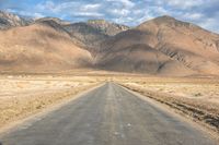 a large open country road in the desert with mountains behind it and a cloud filled sky above