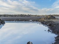 a blue body of water with rocks around it on the shore of an island with some water in it