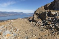 A rugged landscape in the Okanagan Valley, British Columbia. A clear sky highlights the rugged surface of the bedrock and rocky outcrops. A road winds through the valley, leading to a reservoir and quarry in the distance.