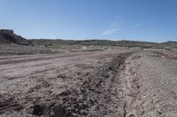A low road in the desert of Utah, lined with red rock formations. The rugged landscape of the San Rafael Swell is contrasted by the clear sky above. A scenic off-road track for nature enthusiasts.