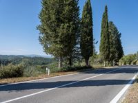 A road through the rural landscape of Tuscany, Italy. The rugged terrain and clear sky create a picturesque view. Nature's beauty is showcased with cypress trees lining the road.