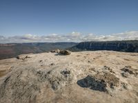 a couple of rocks sitting on top of a mountain with a view of a valley in the distance