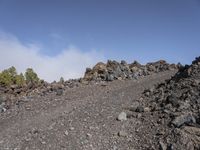 A rugged mountain road in Tenerife, Spain, winds through a barren desert landscape. The clear sky reveals a stunning view of the mountains and clouds. This off-road track offers a glimpse of the untouched wilderness of Europe.