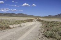 A rugged desert landscape in California, with mountains and vegetation in the distance. The clear sky contrasts with the dirt road and grass surface. Off-road track leads through the plain, surrounded by sandy terrain.