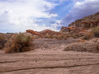 A rugged off-road track in California leading through a mountainous landscape. The sky is gloomy with grey clouds. Nature's formation of mountain landforms and dry riverbeds can be seen along the way.