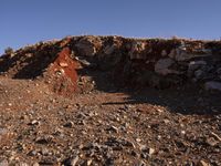 This image captures a rugged and rocky landscape in Shangri-La, Yunnan, China. The photo showcases a dirt road that weaves through mountains and hills, surrounded by trees and leafy vegetation. The brown and rocky surface resembles the geology of a Mars-like terrain. The clear sky provides a striking backdrop to the natural formation and outcrop of rocks and rubble. This off-road track offers a glimpse into the unique and diverse landscapes of Asia. The photo elicits a sense of adventure and exploration in this remote and intriguing part of China.