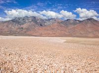 A rugged off-road track winding through a mountainous landscape. The sky is adorned with fluffy white cumulus clouds, contrasting with the beige plains. A perfect day for outdoor activities and exploring nature's beauty.