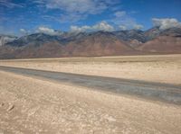 A rugged off-road track in the California desert, surrounded by mountain landforms. The gravel and dirt road cuts through the vast grass plains, with clear blue skies and clouds on the horizon.