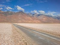 the desert road is surrounded by mountains and clouds in the background with several people on it