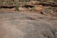 A rugged landscape in Canyonlands, Utah. Red rock formations and bedrock outcrops create a stunning natural scene. Off-road tracks wind through the rugged terrain. A perfect day for outdoor recreation in the USA.