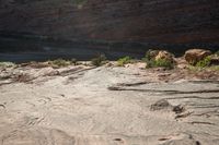 This image captures the stunning landscape of Utah, USA. The red rock formations create a rugged and beautiful backdrop for outdoor recreational activities. The open space is filled with grass, vegetation, and wood, creating a diverse and natural environment. The rocky terrain showcases the unique bedrock outcrops and slopes of the area. Visitors can enjoy off-road tracks and explore the canyonlands. The brown rock surface and rock formations add character to the scenery. This photo represents the beauty and adventure that can be found in the Moab Rim area of Utah.