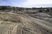 This is an image of the rugged terrain and stunning landscape in the San Rafael Swell, Utah, USA. The red rock formations, grassy hills, and desert terrain create a beautiful and dramatic scene. A dirt road curves through the hills, leading the viewer's eye through the image. The rocky outcrops and bedrock formations showcase the erosion that has shaped this area over time. The clear blue sky with fluffy white clouds adds to the natural beauty. This photo captures the essence of the unique and picturesque San Rafael Swell.