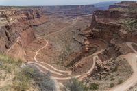 A breathtaking aerial view of Canyonlands, Utah. Red rock formations and rugged terrain create a stunning landscape. The Shafer Trail, a dirt road with gravel and sand, winds through the valley with switchbacks. A perfect day to explore the off-road tracks of nature.