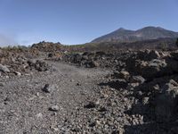 This image captures the rugged and scenic landscape of Tenerife, Spain. A dirt road winds through the mountainous terrain, surrounded by rocks, boulders, and desert-like features. The clear sky above contrasts with the rocky surface below, showcasing the wild and untamed nature of the area. This off-road track takes you through the wilderness and showcases the geology and bedrock of Europe. Tenerife's unique mountain landforms and stunning views make it a must-visit destination for nature enthusiasts. Take a journey over the clouds and explore the untamed beauty of Tenerife.