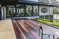 This image showcases a beautiful villa in Thailand with a stunning landscape. The villa features architecture with a combination of wood, glass walls, and a beautiful wood floor. The design of the villa includes outdoor open spaces with grass surfaces, a deck, and furniture such as tables and chairs. The interior design of the villa reflects a modern and stylish aesthetic, with a spacious and welcoming room. This is a perfect place for tourists and visitors to relax and enjoy the recreational facilities, including a hotel, restaurant, and bar, all in a picturesque setting with clear skies.
