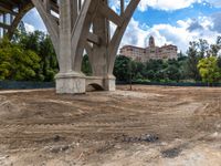 the dirt is brown in the middle of an area with a bridge and hotel in the background