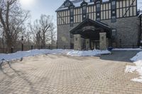 This image showcases a classic residential building in Canada, located in a suburban area of Toronto. The architecture features beautiful brickwork and a row of windows. The surroundings include a snow-covered open space, with trees and a clear sky in the background. The streetlight illuminates the road surface, creating a cozy ambiance during the winter season. This photo captures the charm of a suburban neighborhood in Toronto, combining classic architecture with the tranquility of the winter landscape.