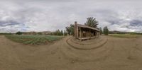 A gloomy day in rural California, with a grey sky and open spaces. The landscape features a straight road leading to a property with a shack and barn. The natural environment is a mix of grass, dirt, and sand.