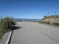 a lone highway on the hillside with a small shrub and mountains in the distance of it