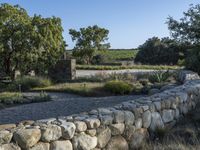 A serene view of a lush landscape in rural California. Ancient stone walls and a historic barn create a picturesque scene. Clear skies and green grass enhance the beauty of this rural home.