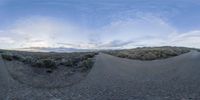 a panoramic view of a street in the middle of nowhere with a cloud filled sky