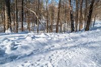 This is an image of a snowy rural road in Ontario, Canada. The picture showcases a snow-covered trail in the middle, with a person skiing down it. The scenic landscape features snow-covered trees and fields, with Toronto visible in the distance. The cloudy sky adds to the winter atmosphere. This photo captures a typical winter day on a rural road in Ontario, with fresh snow on the ground. It represents the beauty of the snowy Canadian countryside.