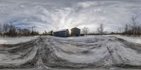 the snow is flowing over the snow field next to a barn under cloudy skies,